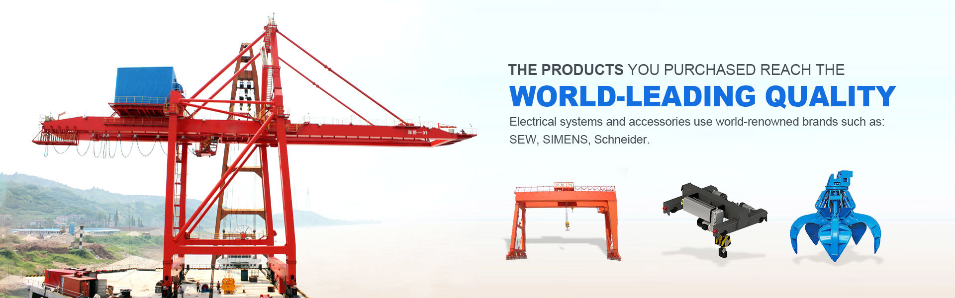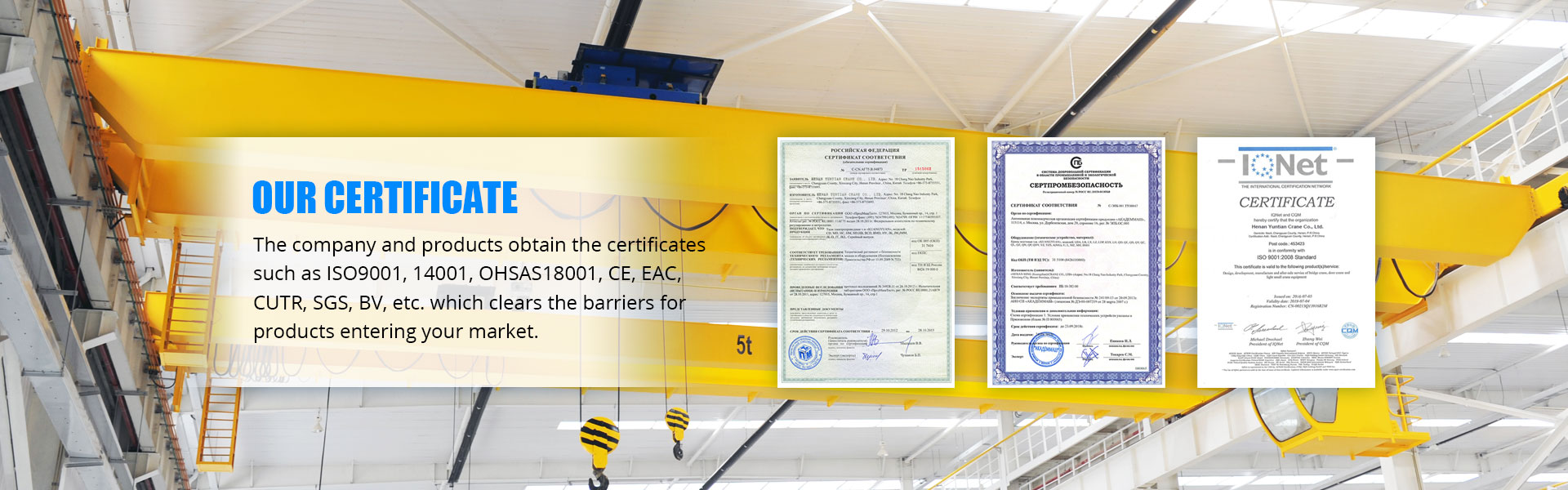 Podríem subministrar tot tipus de grues industrials de 0.25tons a 900tons, passar GB / T 19001-2000 idt ISO 9001: 2000, GB / T 24001-2004 idt ISO 14001: 2004, GB / T 28001-2001, OHSAS 18001: 1999, CE, GOST, SGS, TUV, BV, etc.